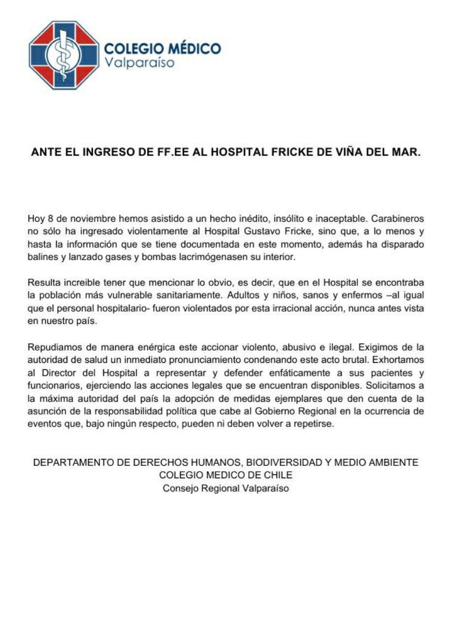 Ante el ingreso de FF.EE al Hospital Fricke de Viña del Mar, el Colegio Médico de Valparaíso se pronunció