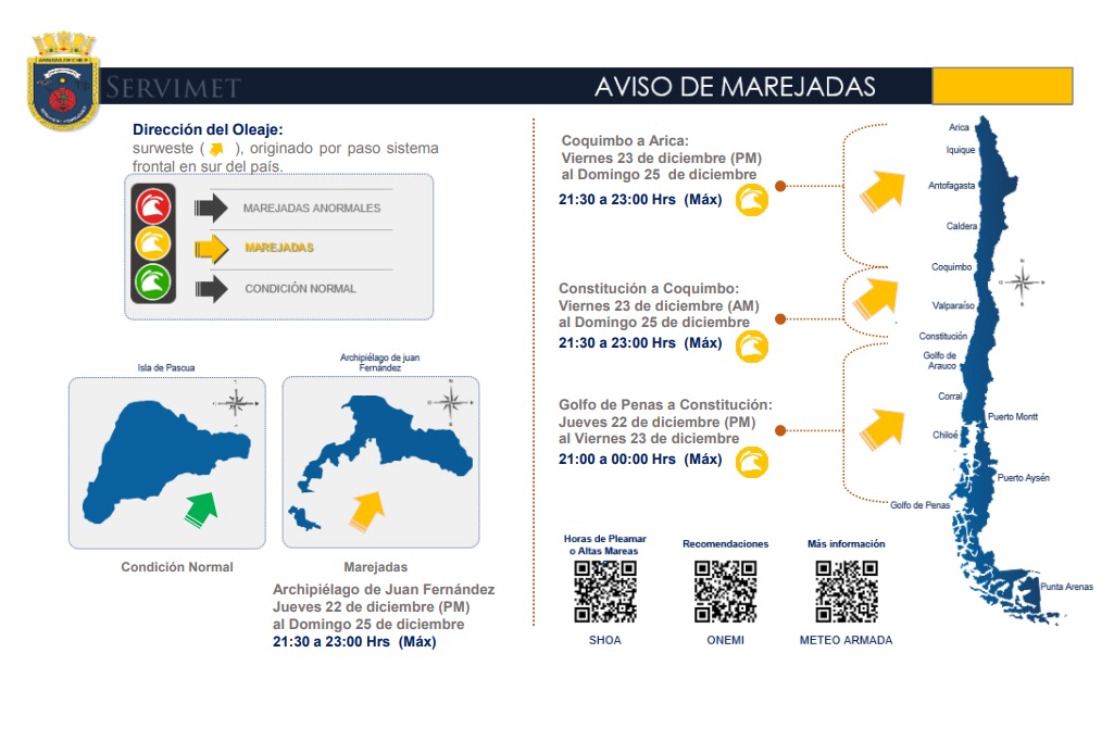 El Jefe del Centro Meteorológico Marítimo de Valparaíso Subrogante, Teniente Primero Ignacio Ojeda Horr explicó que: “a contar del día jueves 22 de diciembre, esperamos marejadas del suroeste desde el Golfo de Penas hasta Arica, incluyendo el Archipiélago Juan Fernández, generando oleaje con rompiente en bahías abiertas a esa dirección, alcanzando su mayor desarrollo durante las horas de pleamar o altas mareas y en particular entre las 21:00 y 00:00 hrs. Estas marejadas corresponden al aviso número 30 que afecta a las costas continentales durante el presente año”.