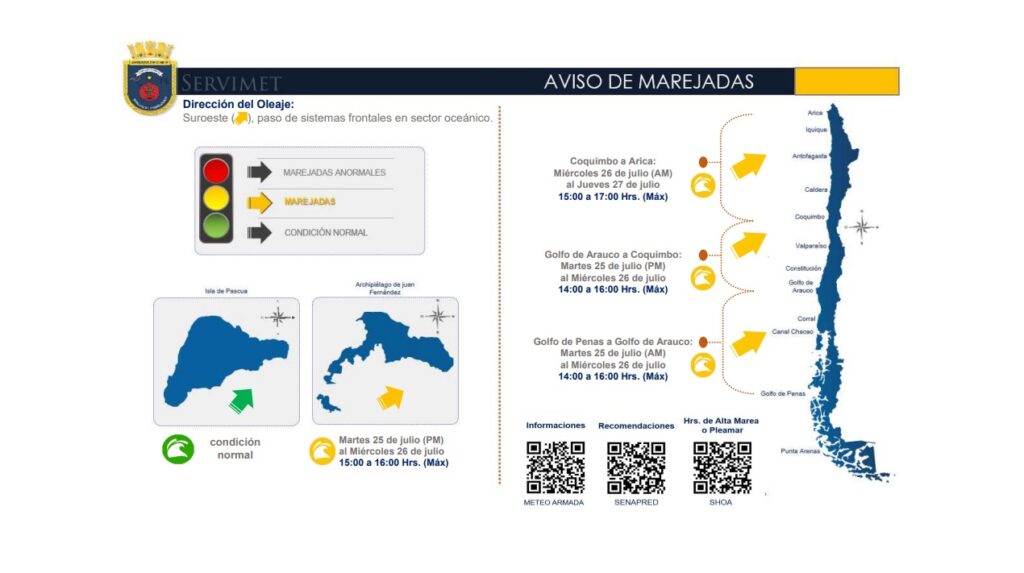 El Jefe del Centro Meteorológico Marítimo de Valparaíso, Capitán de Fragata Gonzalo Concha Salas explicó que: “a contar del día martes 25 de julio, esperamos marejadas del suroeste desde el Golfo de Penas hasta Arica, incluyendo el Archipiélago Juan Fernández, generando oleaje con rompiente en bahías abiertas a esa dirección, alcanzando su mayor desarrollo durante las horas de pleamar o altas mareas y en particular entre las 14:00 y 17:00 hrs. Estas marejadas corresponden al aviso número 22 que afecta a las costas continentales durante el presente año”.