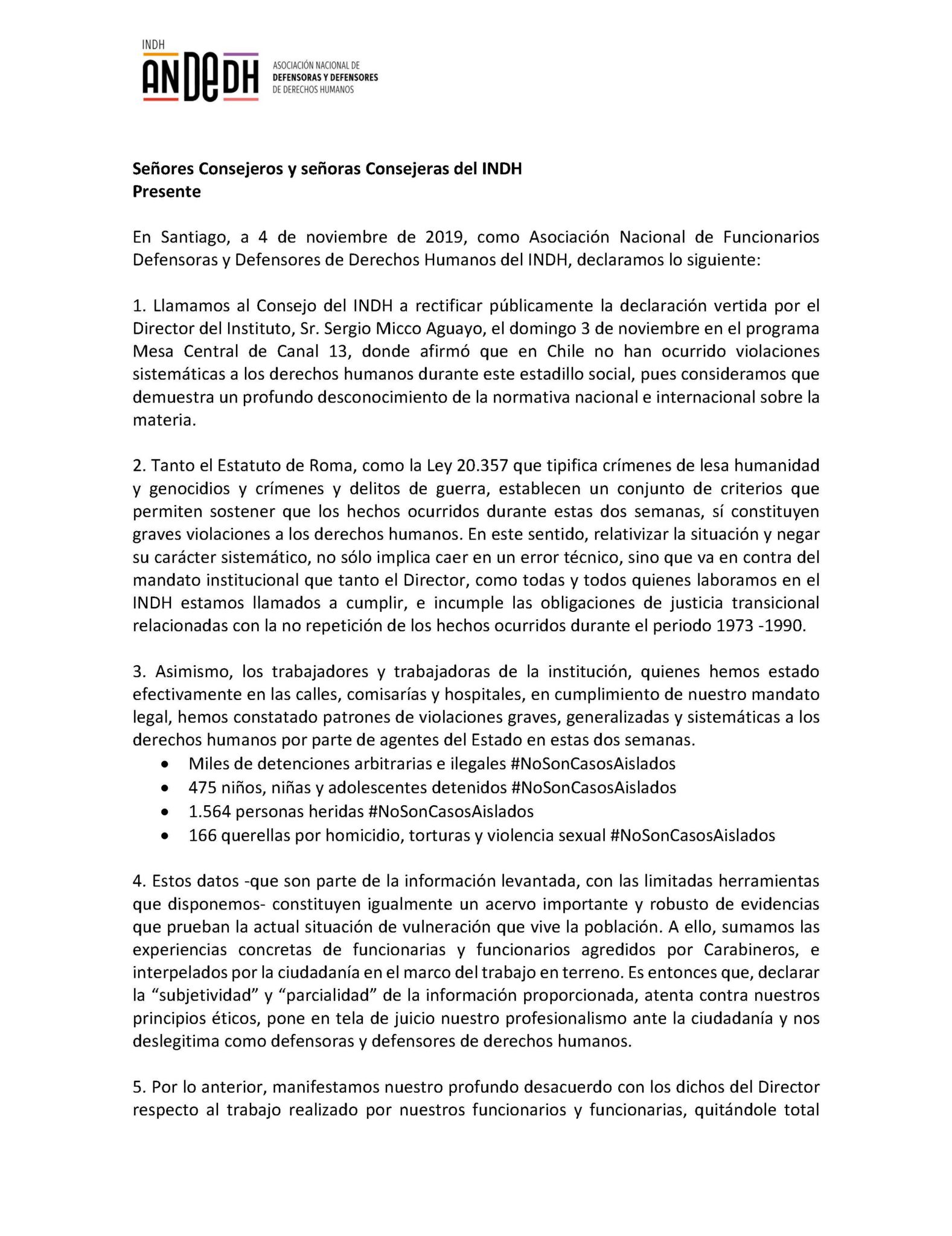 El comunicado emplaza al consejo del INDH a rectificar públicamente la declaración que hizo el pasado domingo 3 de noviembre por el Director del Instituto, Sergio Micco Aguayo, en el programa Mesa Central de Canal 13.