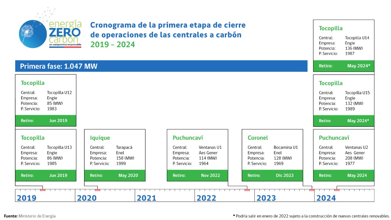 El retiro de las operaciones de las unidades se realizará través de un cronograma que establece el cese de los primeros 1.047 MW de las ocho centrales más antiguas a 2024. Dichas unidades están en las comunas de Iquique (1), Tocopilla (4), Puchuncaví (2) y Coronel (1), y representan en su conjunto un 19% del total de la capacidad instalada de centrales a carbón.