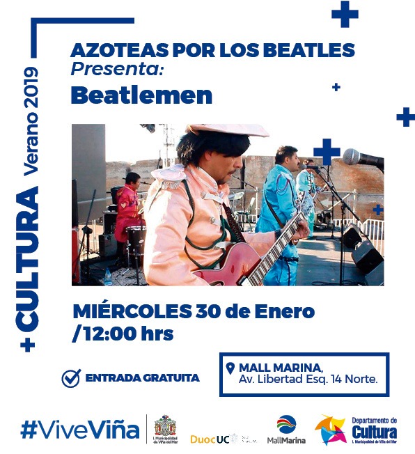 A modo de tributo del último concierto de los Beatles realizado hace 50 años en la azotea de Apple Corps en Londres, se realizará un espectáculo musical de manera simultánea en todo el país el miércoles 30 de enero, desde las 12:00 horas. En Viña el show estará a cargo de la banda Beatlemen y tendrá cabida en el Mall Marina, ubicado en Av. Libertad esq. 14 norte.