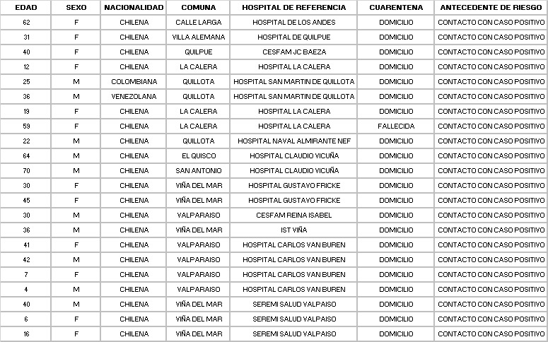 De los 21 nuevos casos (exceptuando la mujer fallecida en La Calera), 12 son mujeres y 10 son hombres, 19 chilenos y dos extranjeros. Todos se contagiaron a través de un caso positivo y están realizando cuarentena en sus domicilios.
