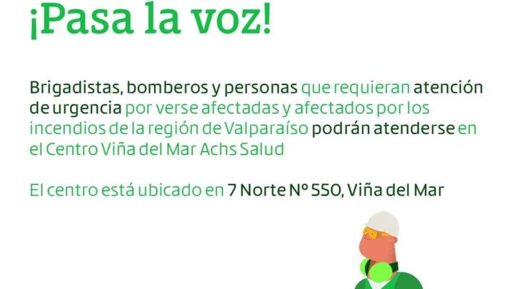 Con el fin de brindar apoyo, en el contexto de la emergencia producida por los incendios forestales que afectan a la región de Valparaíso, la Achs en coordinación con la Municipalidad de Viña del Mar, ha puesto a disposición de las personas damnificadas, voluntarios de bomberos, rescatistas y brigadistas los siguientes servicios: