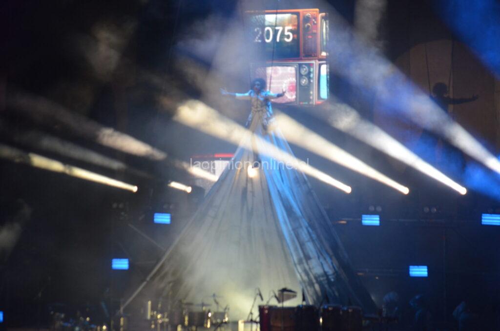 El evento estaba programado para las 20:00 hrs. Sin embargo, a las 19:15, Chico Trujillo estaba en el escenario y comenzaba el show con sus canciones más conocidas. El público apostado en el anfiteatro, que a esa hora llegaba aproximadamente al 85% de su capacidad, bailó, cantó y aplaudió cada una de sus canciones. Un momento singular, fue cuando la banda se extendió sobre el escenario, recostándose, tocando una canción de cuna y entonando luego “duerme duerme negrito, que tu mama está en el campo.” Algunos de los asistentes siguieron la performance haciendo lo mismo en sus ubicaciones.