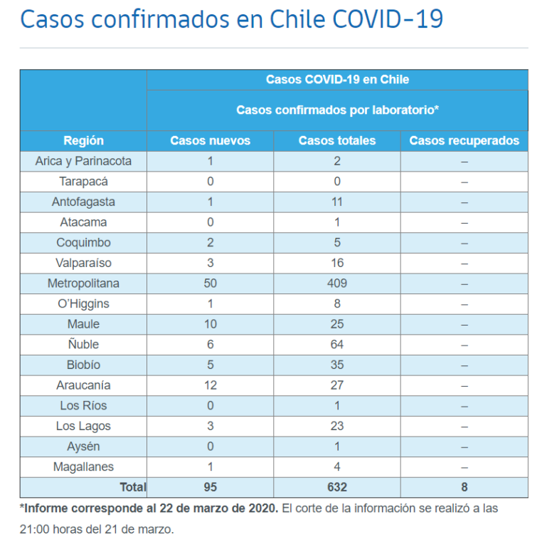 Tras la Vocería oficial de etse domingo 22 de marzo , el Ministerio de salud confirmó 95 nuevos casos de Coronavirus en las últimas 24 horas a nivel nacional, lo que se traduce en un total de 632 casos.