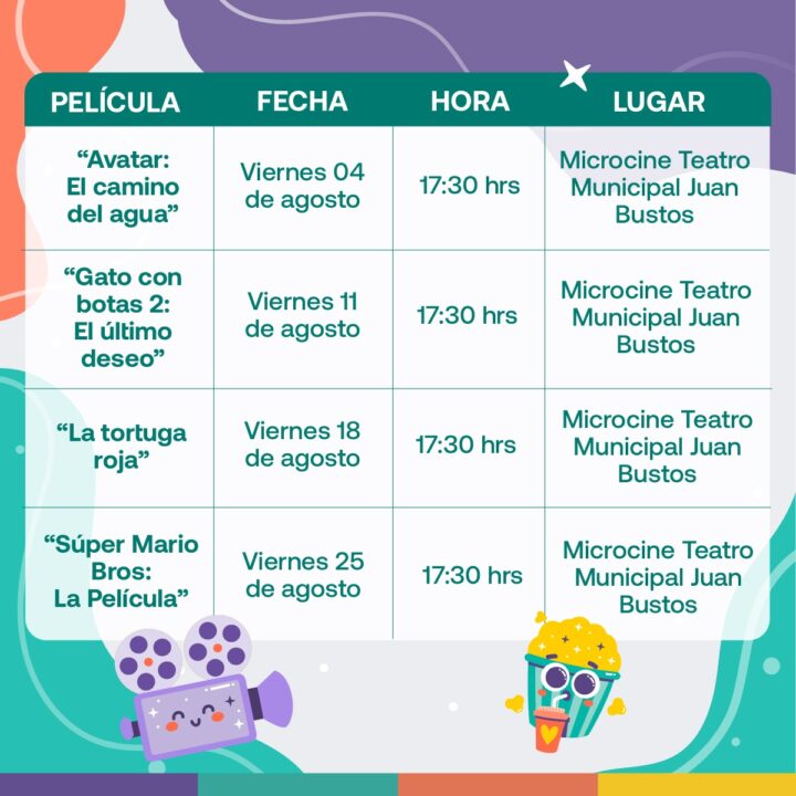 Quilpué además preparó un ciclo de cine para las infancias. El Teatro Municipal Juan Bustos Ramírez proyectará las películas “Avatar: el camino del agua”, “Gato con Botas 2: el último deseo”, “La tortuga roja” y “Super Mario Bros: la película”, disponibles los viernes 04, 11, 18 y 25 de agosto a las 17.30 hrs.