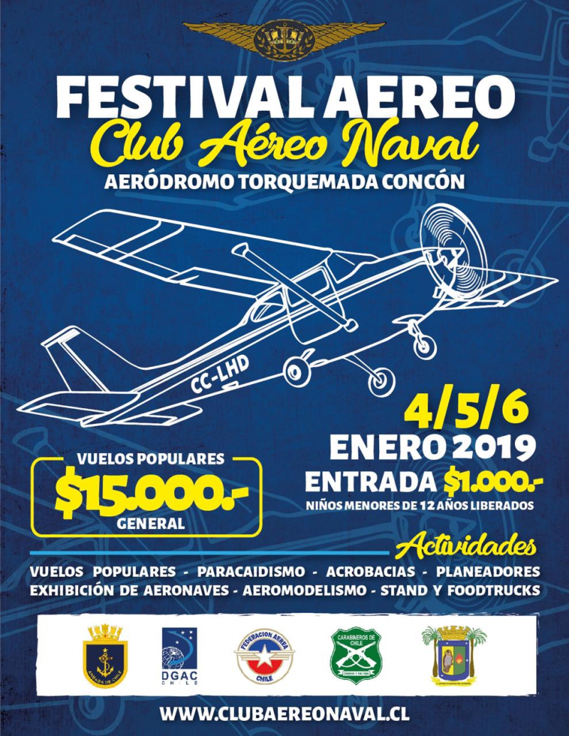 Al igual que en años anteriores, el Club Aéreo Naval realizará un Festival Aéreo entre el 4 y 6 de Enero. En la instancia, habrán exhibiciones aéreas de acrobacias, planeadores, paracaidismo y vuelos populares, también muestras estáticas de aeronaves y empresas del rubro, y un patio de comidas.