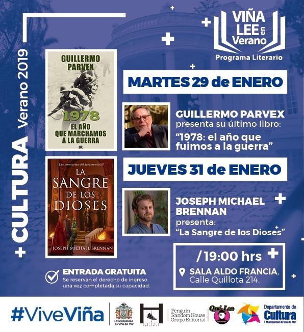 Los escritores nacionales Guillermo Parvex y Joseph Michael Brenann, darán inicio a las primeras jornadas de ’’Viña lee en verano 2019’’ donde expondrán sus obras más recientes. Estas exposiciones se realizarán el día martes 29 y jueves 31 de enero, desde las 19.00 horas en la sala Aldo Francia del Palacio Rioja, ubicado en calle Quillota 214.