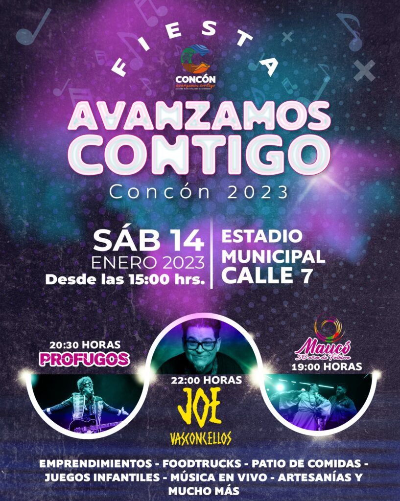 Siguiendo el Programa de Verano que ya ha traído a la comuna a artistas como Grupo La Rosa y ChysteMC, este sábado 14 de enero se llevará a cabo la Fiesta Avanzamos Contigo Concón 2023, evento que desde las 15:00 horas llenará el Estadio Municipal de Calle 7 con stands de emprendedores, juegos infantiles, foodtrucks y un escenario que tendrá la presencia del artista nacional Joe Vasconcellos y la renombrada banda tributo a Soda Stereo, Prófugos.