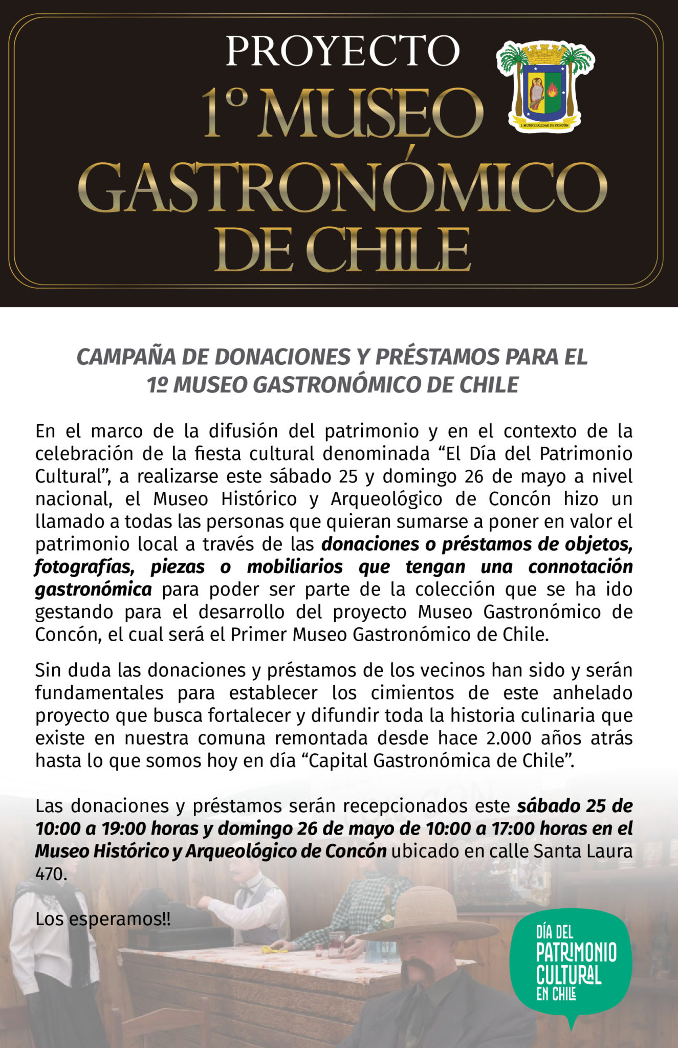 Para el desarrollo de la exposición “Historia de la Gastronomía en Concón – Proyecto Primer Museo Gastronómico de Chile” han sido fundamentales los aportes de los vecinos reflejados en donaciones o préstamos de piezas, mobiliarios y utensilios de cocina antiguos, los que han hecho posible que la colección de éste futuro museo crezca día a día, porque durante las jornadas del 25 y 26 de mayo se recibirán donaciones y préstamos de parte de todos los vecinos que se quieran sumar a este comunitario proyecto. Las donaciones o préstamos serán recepcionadas el día 25 de mayo de 10.00 a 19.00 horas y el 26 de mayo de 10.00 a 17.00 horas en el Museo Histórico y Arqueológico de Concón, calle Santa Laura 470.