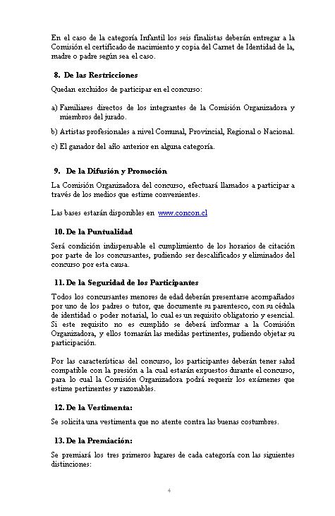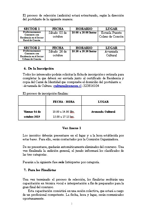 Los interesados que residan en la comuna podrán inscribirse en tres categorías: Infantil, Juvenil y Adulto; mientras que el proceso de audiciones será en las siguientes fechas: 5 octubre en la Escuela Puente Colmo y el Sábado 26 de octubre en la Avanzada Cultural.
