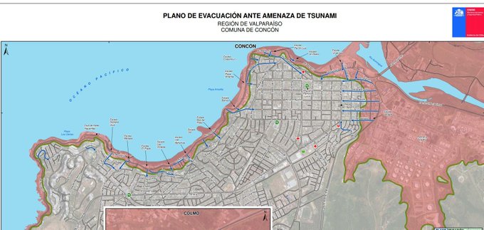Tras el aviso de evacuación que incluye mensaje en algunos celulares, se activarán todos los protocolos de emergencia para evacuar la zona costera, donde se incluyen algunos puntos de encuentro como la Plaza Patricio Lynch, la Plaza ubicada frente Biblioteca, frente la Cruz Roja de Caleta Higuerillas y estacionamientos ubicados en un sector cercano a la Escuela Puente Colmo en el Sector Rural de Concón.