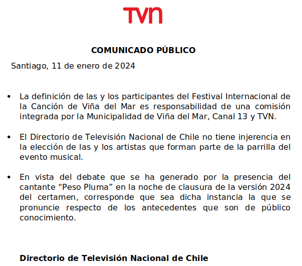 En un comunicado emanado de la estación estatal, el directorio “se bajó” de la polémica, al menos directamente, indicando que “corresponde que sea dicha instancia (la Comisión Organizadora del Festival) la que se pronuncie respecto de los antecedentes que son de público conocimiento.