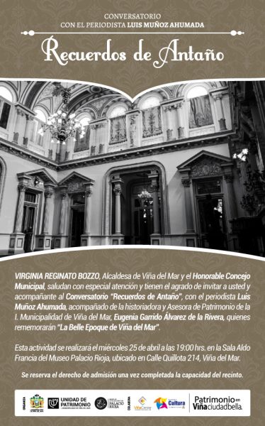 La Belle Epoque viñamarina, un período de esplendor para la clase dirigente en el país entre la última década del siglo XIX y las dos primeras del XX. Ese será el tema central del próximo conversatorio denominado “Recuerdos de Antaño” organizado por la Unidad de Patrimonio de la Municipalidad de Viña del Mar en el Museo Palacio Rioja para el próximo miércoles 25 de abril a las 19:00 horas.