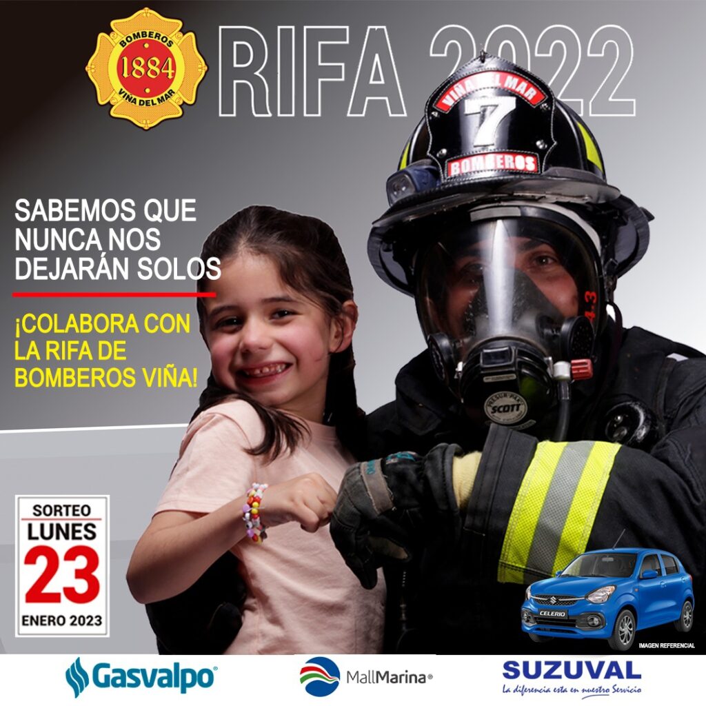 Durante esta nueva edición de la campaña, Bomberos de Viña del Mar cuenta con el auspicio de Suzuval, Mall Marina y Gasvalpo; lo que contribuy en financiar los gastos operacionales de la Rifa. El sorteo se llevará a cabo el 23 de enero, donde se repartrá : 1 automóvil Suzuki Celerio 1.0 GLX AC BT 0 kms, 1 televisor led Samsung Smart TV 55″ ultra HD 4k, 1 notebook Asus Laptop i5 de 14” pulgadas, 1 secadora frontal Ursus Trotter de 8 kg, 1 consola Nintendo Switch modelo Oled blanco y 1 parlante bluetooth Karaoke Ultraextreme Master-G. Las Bases se encuentran en el sitio web www.bomberovinadelmar.c l