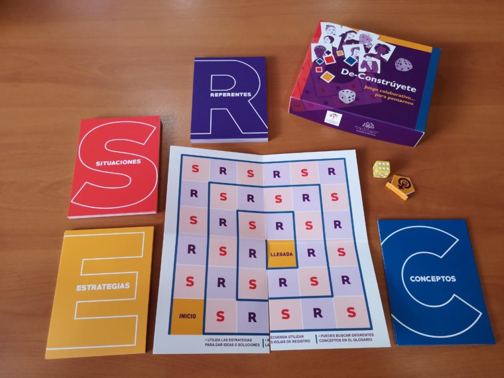 “De-Constrúyete” consiste en un tablero y varias tarjetas. Se avanza tirando un dado y, al caer en las casillas marcadas, hay que destapar tarjetas, que pueden describir una situación de violencia de género o mostrar datos de una mujer referente.