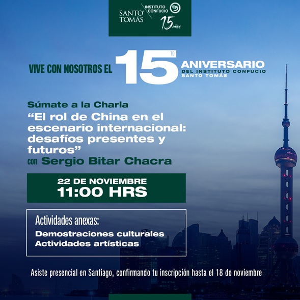 Hace 15 años se creó el Instituto Confucio Santo Tomás (IC ST) en Viña del Mar, transformándose en el primer Instituto Confucio de Chile; dentro de este contexto, el 22 de noviembre se celebrará el aniversario de la entidad, con una conferencia relacionada al rol actual de China, donde además, se realizará un recuento de lo realizado durante estos 15 años de historia.