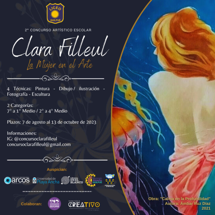 Por ello, el Liceo Artístico Guillermo Gronemeyer de la ciudad del sol, desde el año 2022 impulsa esta iniciativa cultural en la que colaboran importantes instituciones educativas y culturales de la región, como la Universidad de Playa Ancha, el Instituto Arcos y el Municipio Abierto de Quilpué. El certamen, junto con posicionar la figura de Clara Filleul como patrimonio de la comuna, busca potenciar el talento y la experimentación visual de los estudiantes de nuestro país, mediante la creación y difusión de sus trabajos visuales y cuya temática este año es “La Mujer en el Arte”, en reconocimiento a la mujer en el ámbito artístico, ya no como musa inspiradora, sino como creadora y protagonista de la historia de arte.