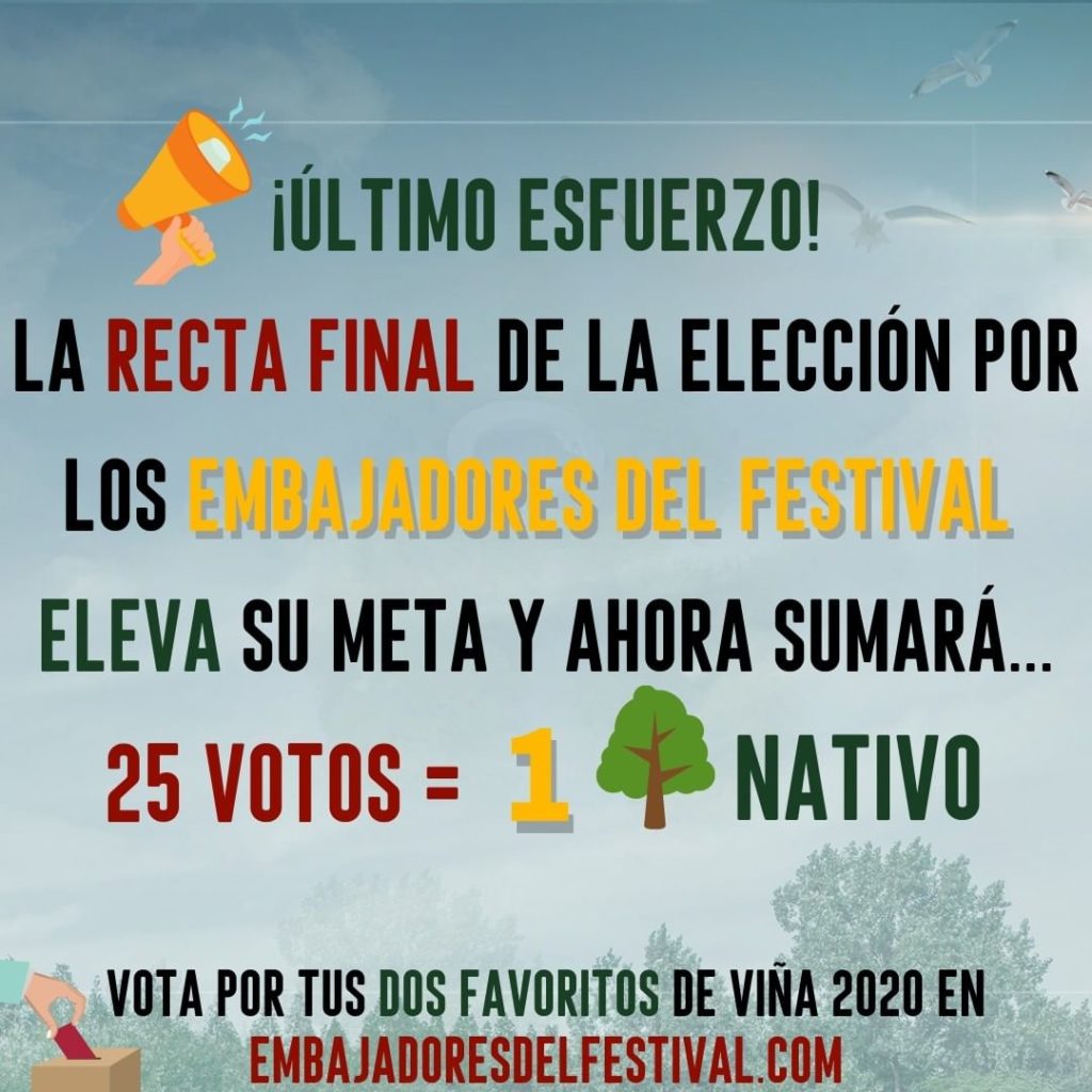 La campaña impulsada por la Asociación de Comunicadores (ADC) que busca reforestar la Quinta Vergara y el Jardín Botánico propuso que el público eligiera a los candidatos del festival para ser Embajadores Sustentables a través del voto online en la plataforma www.embajadoresdelfestival.com y por cada 100 votos, se plantaría un árbol nativo, pero hoy se anunció un cambio importante.