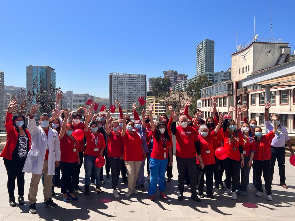 Para concientizar sobre el #ACV, el establecimiento viñamarino se sumó a Sociedad de Neurología, Psiquiatría y Neurocirugía de Chile (Sonepsyn), y la Asociación Chilena de Enfermedades Vasculares Encefálicas (Aceve), en su campaña anual, que este año se denomina #LevantaLaMano, para llamar la atención sobre los síntomas de esta enfermedad a través de diferentes actividades con la participación de funcionarios, funcionarias y el voluntariado del Hospital.