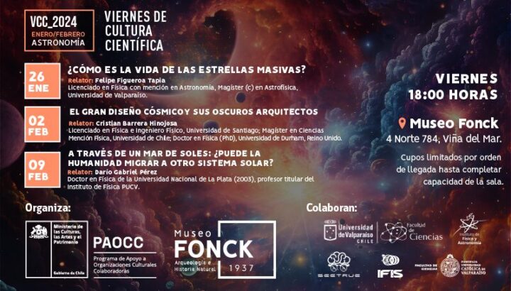 Aprender y dialogar con especialistas y maravillarse con los avances científicos sobre el cosmos será un entretenido panorama de las tardes de los viernes este verano en los VCC de Museo Fonck, ubicado en 4 Norte, esquina 1 Oriente, Viña del Mar.