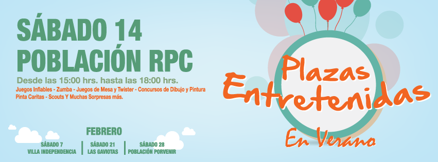 La segunda jornada de “Plazas Entretenidas en Verano”, actividad incentivada por la Ilustre Municipalidad de Concón, se realizará este sábado 14 en la Cancha Nueva RPC, ubicada en la Población RPC, a partir de las 15:00 horas. Este evento tiene el objetivo de llevar diversión a las plazas de la comuna donde los niños podrán disfrutar de un panorama distinto y muy entretenido.