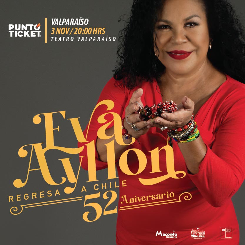 Como parte de su gira “Regreso a Chile 52 Aniversario”, llega a Valparaíso, EVA AYLLÓN la voz negra del Perú, considerada la mejor cultora de la música criolla y Afroperuana, con 14 nominaciones a los premios Grammys y con más de 30 producciones discográficas publicadas. La cantante limeña, -quien desde muy joven recorre su patria natal con su voz cautivante y las músicas de su tierra- se abrió paso con su canto también en el resto del mundo, como “la reina del landó”, ritmo y danza popular internacionalmente. María Angélica Ayllón Urbina nombre real de Eva Ayllón, es una mujer que encanta por la versatilidad de su voz. Es una gran artista de prestigio internacional. La calidad de sus interpretaciones le ha permitido incursionar en diversos géneros musicales, característica que la ha llevado a compartir escenario con artistas internacionales como Marc Anthony, Gilberto Santa Rosa, Mariza, Raphael, Alex Lora, Pedro Aznar, El Gran Combo de Puerto Rico y Armando Manzanero.