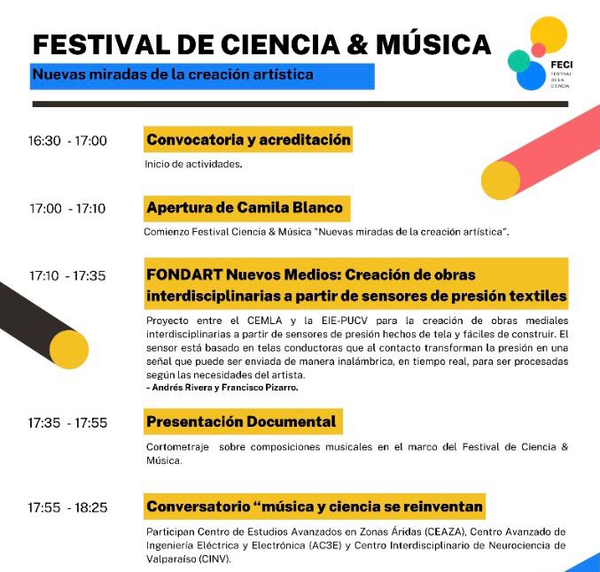 Surge así el “Festival Ciencia & Música: Nuevas miradas de la creación artística”. La actividad, cuenta con un equipo de trabajo de alto nivel, conformado por músicas y músicos chilenos, el Centro Avanzado de Ingeniería Eléctrica y Electrónica (AC3E); el Centro Interdisciplinario de Neurociencia de Valparaíso (CINV); el Centro de Estudios Avanzados en Zonas Áridas (CEAZA); y con el apoyo de los PAR EXPLORA de Valparaíso y Coquimbo, Valparaíso Creativo y la Ilustre Municipalidad de Viña del Mar.
