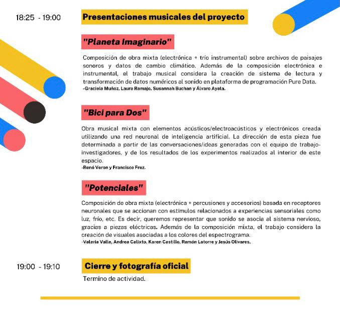 Las piezas musicales compuestas son “Planeta Imaginario” de Graciela Muñoz, obra mixta de electrónica más trío instrumental, sobre archivos de paisajes sonoros y datos de cambio climático del Centro Avanzado de Zonas Áridas, CEAZA. Por su parte el compositor René Verón es autor de la obra mixta “Bici para Dos”, que incorpora elementos acústicos/electro acústicos y electrónicos y fue creada utilizando una red neuronal de inteligencia artificial en conjunto con el Centro Avanzado de Ingeniería Eléctrica y Electrónica, AC3E. El tercer tema musical titulado “Potenciales”, estuvo a cargo de Valeria Valle, también una obra mixta de electrónica más percusiones y accesorios, basada en receptores neuronales que se accionan con estímulos relacionados a experiencias sensoriales como luz o frío. Esta obra fue creada en trabajo conjunto con el Centro Interdisciplinario de Neurociencia de Valparaíso, CINV.