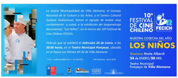 El evento organizado por el Centro Cultural perteneciente a la Ilustre Municipalidad de Villa Alemana y se viene realizando desde el año 2011. En esta ocasión contará con la Muestra Cosecha del Año, presentando a la comunidad largometrajes de destacados realizadores del país que han dado que hablar durante el último tiempo. “Cabros de mierda” de Gonzalo Justiniano, “Johnny 100 pesos, capítulo 2”, “La última vedette” y “La mentirita blanca”, entre otras.