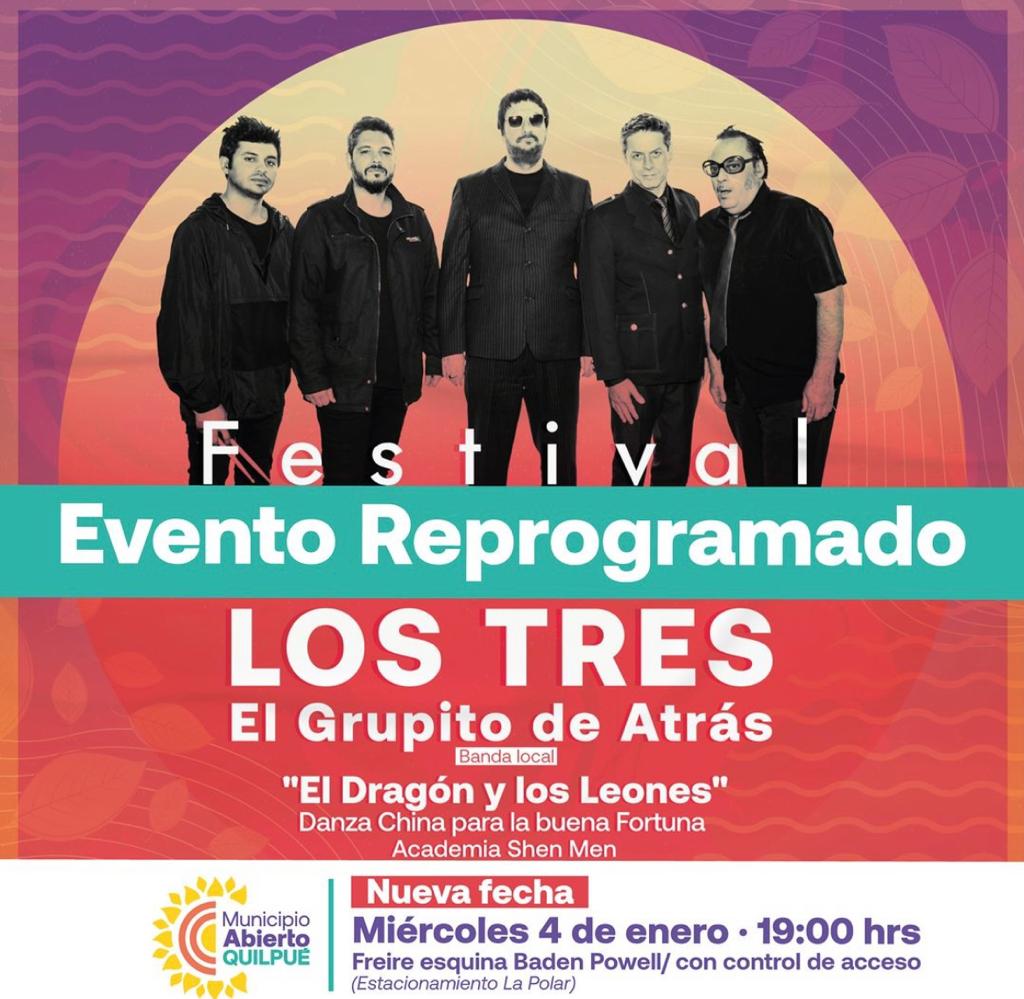 “Como Municipio Abierto, este año hemos querido preparar algo muy especial para despedir el 2022 y darle la bienvenida a este 2023 que esperamos sea muy bueno para todos y todas y particularmente para nuestra comuna de Quilpué donde tenemos hartas tareas para el próximo año. A este festival quisimos traer a un grupo que siempre ha tenido un gran recibimiento en la comuna. Si bien no se pudo realizar en la primera fecha por motivos de fuerza mayor, extendimos todo nuestro apoyo a los artistas y a la productora, con quienes de forma muy fluida y colaborativa pudimos reprogramar este show que sabemos es esperado por muchas personas. Tendremos, además, a la banda local “El Grupito de Atrás” y un entretenido show varieté de Danza China.”