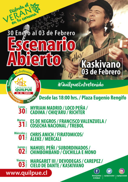 Para hoy 30 de enero está fijado el inicio de la tercera versión del ciclo “Escenario Abierto”, que busca generar un espacio para los nuevos talentos de Quilpué y El Belloto. La iniciativa que se enmarca dentro del programa de verano que ha impulsado la Municipalidad de Quilpué durante este 2017, se desarrollará desde las 18:00 horas en la plaza Eugenio Rengifo.
