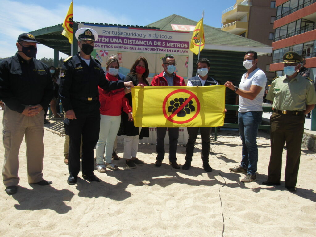 La playa Pejerrey de Algarrobo se realizó el lanzamiento regional del plan preventivo del aforo de playas, en donde se izó una bandera especial que busca advertir un posible rebrote de COVID-19, permitiendo la distancia permitida y un aforo permitido que está establecido por protocolos permitidos por la autoridad sanitaria. En todo momento, fiscalizadores de Seremi de Salud están en terreno para monitorear el cumplimiento de las reglas permitidas.