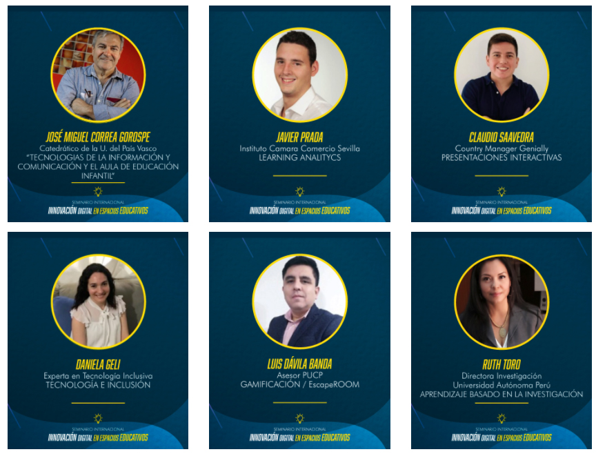 José Miguel Correa (España) abordará las “Tecnologías de la Información y Comunicación y el Aula de Educación Infantil”; Daniela Geli (Argentina) la temática de “Tecnología e inclusión”; Luis Dávila (Perú) expondrá sobre “Gamificación/Escape Room”; Javier Prada (España) hablará sobre “Learning Analytics”; Ruth Toro (Venezuela – Perú) presentará el tema “Aprendizaje basado en la investigación” y Claudio Saavedra (Chile-España) se referirá a las “Presentaciones interactivas”.