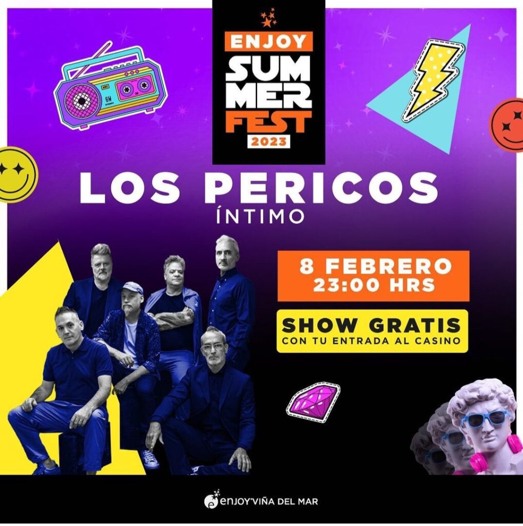El 8 de febrero, desde las 23.00 horas, será el turno de la presentación de Los Pericos, gratis tras el pago de la entrada a la sala de juegos, oportunidad en que la banda de reggae y ska argentina harán disfrutar al público con canciones como Pupilas lejanas, Runaway, Waitin’, Sin cadenas y Párate y mira.