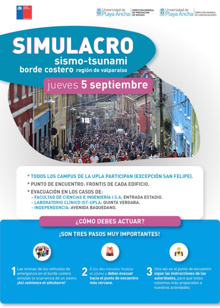 Aproximadamente 2 mil 500 personas, entre funcionarios académicos y estudiantes de los distintos campus de la Universidad de Playa Ancha (UPLA), participarán del simulacro de sismo y tsunami del borde costero convocado por la ONEMI para este jueves 5 de septiembre.