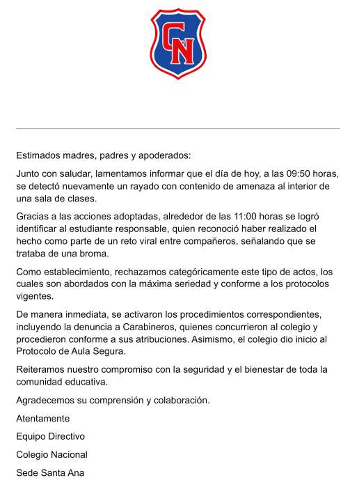 Según se señaló, el establecimiento educacional aplicó todos los protocolos internos de convivencia y seguridad para resguardar el bienestar de la comunidad escolar frente a este tipo de conductas de alto riesgo. Emitieron este comunicado a la comunidad educativa: