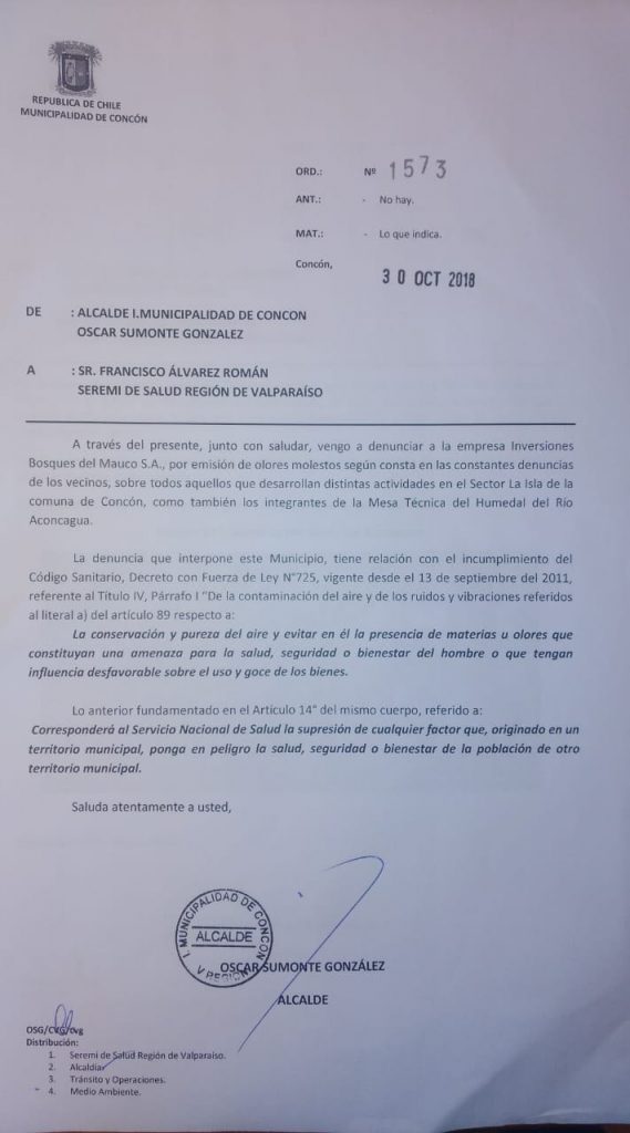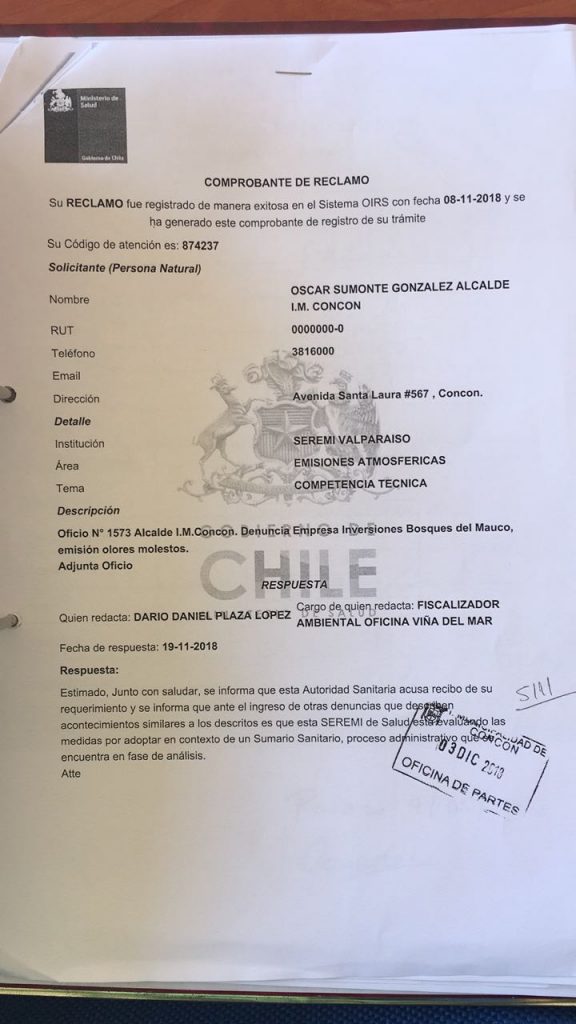En fase de análisis por la Seremía de Salud se encuentra una denuncia realizada a través de un oficio por el alcalde del Municipio de Concón. Óscar Sumonte, contra la Empresa Bosques del Mauco S.A., por la emisión de olores molestos.