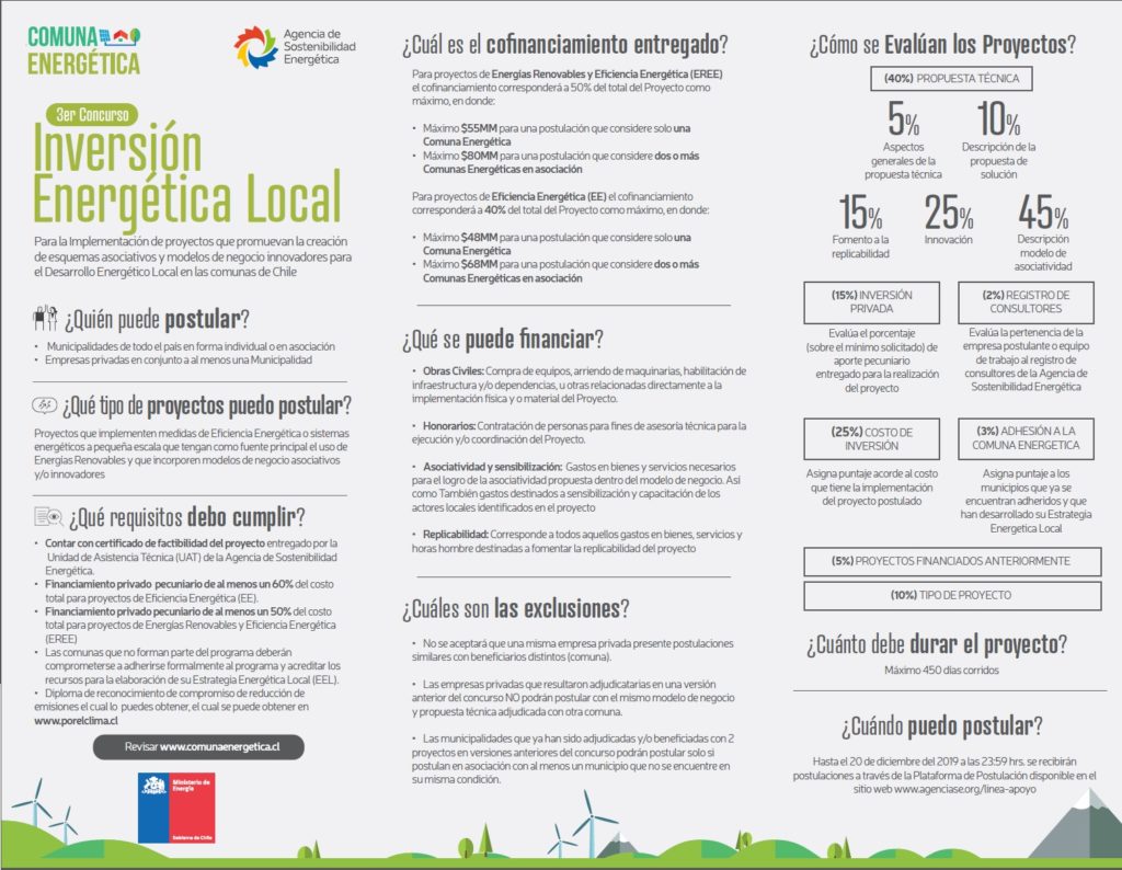 La convocatoria se encuentra dirigida por primera vez a todas las comunas del país y cuenta con fondos de hasta $400 millones para financiar proyectos de Eficiencia Energética y de Energías Renovables, en los cuales se incluyen también por primera vez la posibilidad de cofinanciar proyectos de electromovilidad y calefacción distrital.