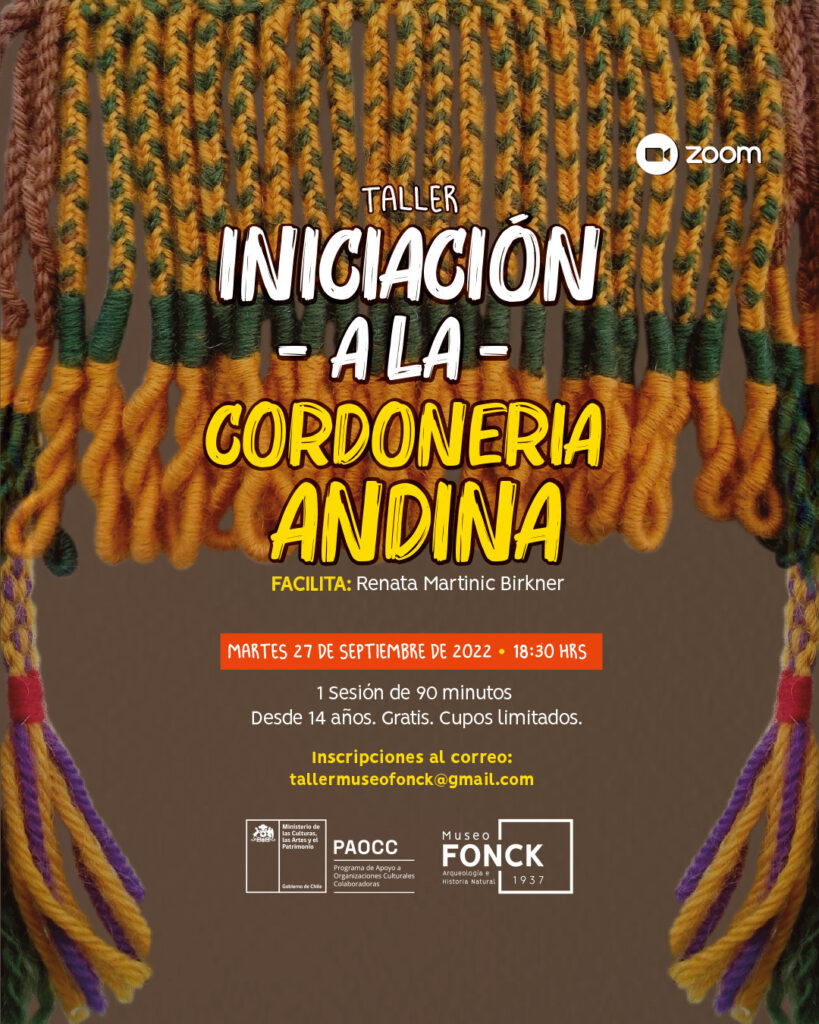 El martes 27 de septiembre de 2022 a las 18:30 horas, Museo Fonck, junto a Renata Martinic, impartirá un taller online gratuito, vía Zoom y dirigido a toda la comunidad mayor a 14 años, donde los asistentes podrán aprender y conocer la cordonería andina como una técnica que pertenece al arte textil de los pueblos indígenas de Latinoamérica.