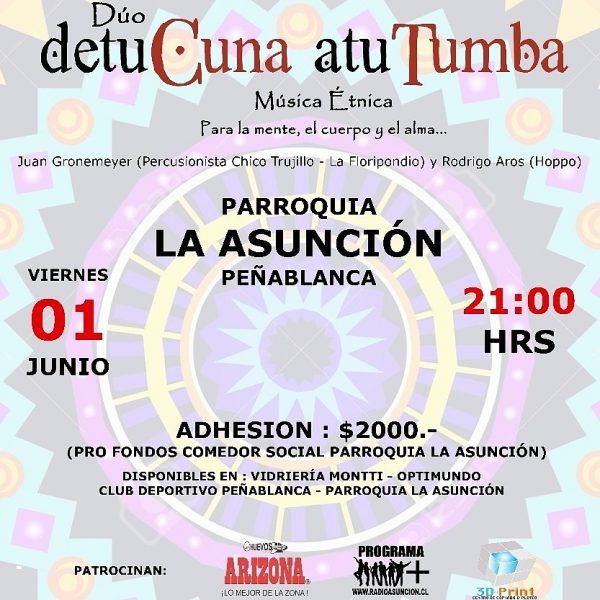 Este viernes 1 de junio se presentará en la Parroquia La Asunción de Villa Alemana (Peña Blanca) el dúo “detuCunaaTuTumba”. La adhesión al evento es de dos mil pesos y las entradas se pueden conseguir en Vidriería Montti, Optimundo Villa Alemana, Club Deportivo Peña Blanca y la propia Parroquia Asunción, en Villa Alemana.