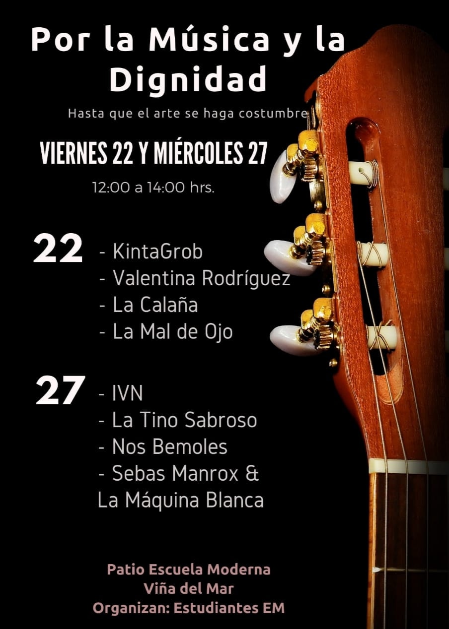 Este viernes 22, Día Mundial de la Música, y miércoles 27 de noviembre desde el mediodía, solistas y bandas de la región se reunirán en la Escuela Moderna sede Viña del Mar para participar en el encuentro musical “Por la Música y la Dignidad”, con la consigna #hastaqueelartesehagacostumbre.