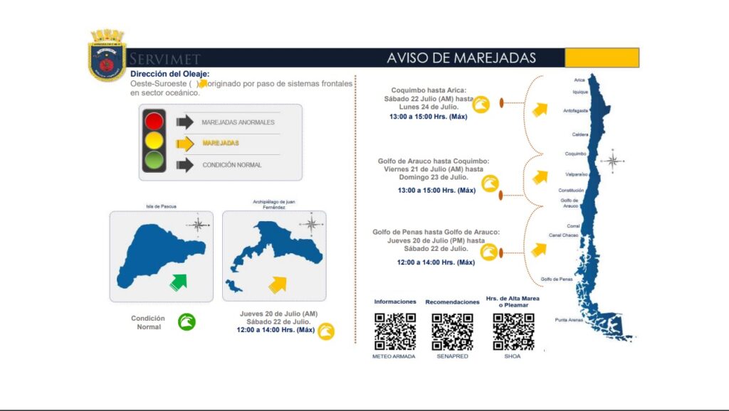 El Jefe del Centro Meteorológico Marítimo de Valparaíso, Capitán de Fragata Gonzalo Concha Salas explicó que: “a contar del día jueves 20 de julio, esperamos marejadas del oeste-suroeste desde el Golfo de Penas hasta Arica, incluyendo el Archipiélago Juan Fernández, generando oleaje con rompiente en bahías abiertas a esa dirección, alcanzando su mayor desarrollo durante las horas de pleamar o altas mareas y en particular entre las 12:00 y 15:00 hrs. Estas marejadas corresponden al aviso número 21 que afecta a las costas continentales durante el presente año”.