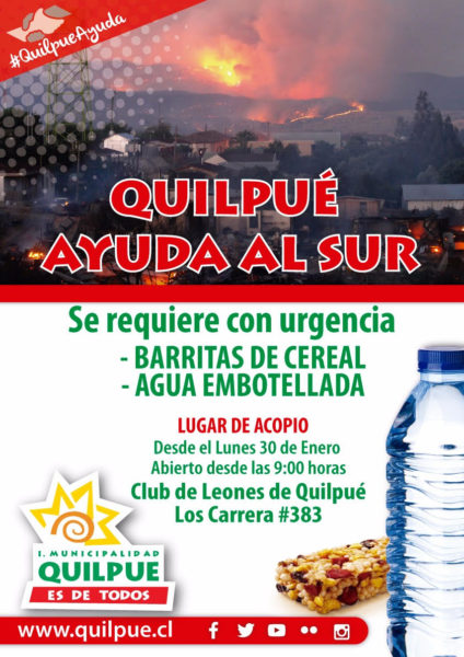 Con el objeto de ir en ayuda de las cientos de familias que se han visto afectadas por los incendios forestales registrados en la zona sur del país, la Municipalidad de Quilpué inicio la campaña “Quilpué Ayuda al Sur”, iniciativa que busca recolectar distintos elementos de primera necesidad.