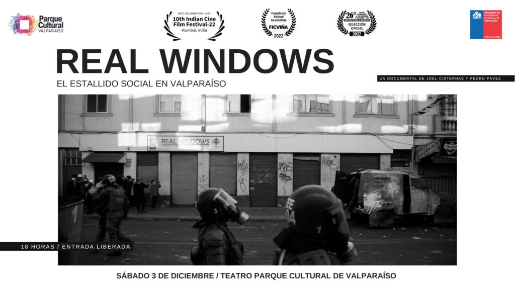 El documental “Real Windows”, dirigido por Pedro Pavez y Joel Cisternas, que registra el estallido social de octubre de 2019 en Valparaíso, y que recibió el Premio del Jurado en el Indian Cine Film Fest de Mumbai (India) se exhibirá el Sábado 3 de Diciembre en el Teatro del parque Cultural de Valparaíso en una función abierta para toda la comunidad.