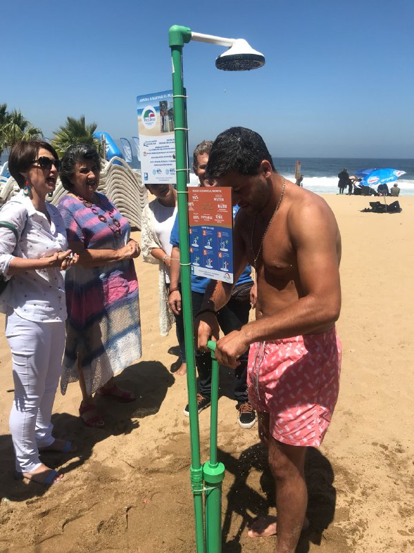 “Este sistema funciona con la fuerza humana en que se bombea el agua desde la arena y se utiliza para refrescarnos. La idea la vi en San Sebastián cuando Viña del Mar ingresó a la red internacional de ciudades del Surf, la traje a Chile como plan piloto para donarla a la ciudad, al concesionario del sector y a los deportistas. También hay otra ducha para sillas de ruedas que queremos implementar”, explicó Jorge Oliva.