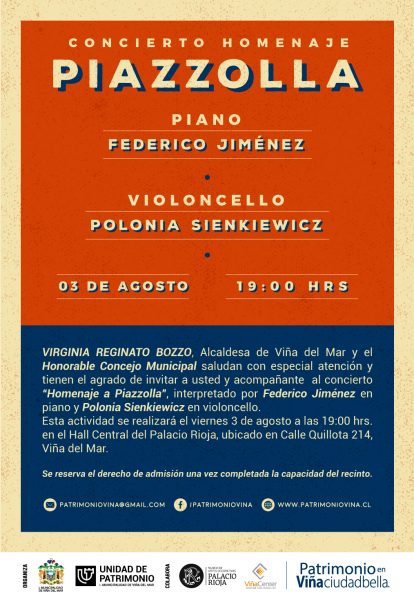 Este viernes 3 de agosto, a las 19:00 horas, se realizará el concierto gratuito “Homenaje a Piazzolla” donde se revisarán canciones como Adiós Nonino, Libertango, Invierno Porteño y otras conocidas obras creadas por Astor Piazzolla, destacado compositor argentino considerado uno de los músicos más importantes e influyentes del siglo XX. Esto en el Hall Central del Museo de Artes Decorativas Palacio Rioja, ubicado en calle Quillota 214.