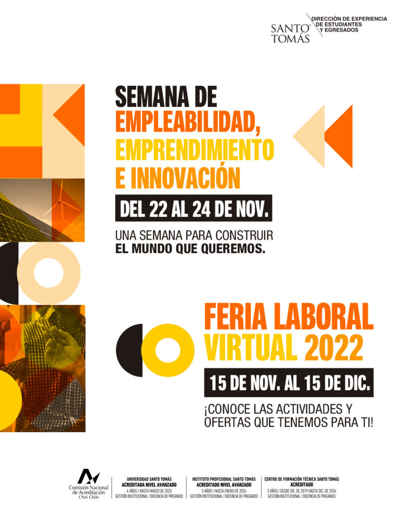 Entre el 22 y el 24 de noviembre y por primera vez de modo presencial, Santo Tomás desarrollará la Semana de la Empleabilidad, Emprendimiento e Innovación, iniciativa que reunirá a estudiantes, egresados, emprendedores y expertos con el fin de compartir experiencias e ideas en torno a estas temáticas. Tomando en cuenta el complejo panorama laboral entre los jóvenes, la actividad contempla una serie de charlas y mentorías abiertas a toda la comunidad en la que se abordarán diversas herramientas útiles para la búsqueda de empleo como: Uso de Linkedin, Comunicación Efectiva en Entrevistas, Pitch en 3 minutos y Currículum Ganador, dictada por Óscar Silva, influencer LATAM de RR.HH. 2019 y con vasta experiencia en áreas de Reclutamiento y Selección.