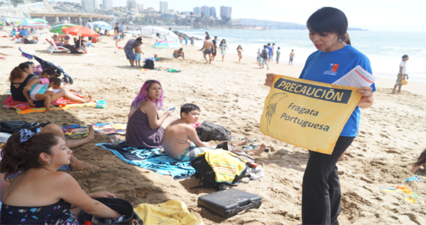 “La Armada ha informado que se ha encontrado ejemplares de fragata portuguesa, que genera una serie de complicaciones en el ámbito de la salud, por lo que se adopta esta medida de prohibición de baño y actividades recreativas en la playa de Caleta Portales, medida que también se mantiene vigente en las playas Caleta Abarca, Acapulco y El Sol de Viña del Mar” .